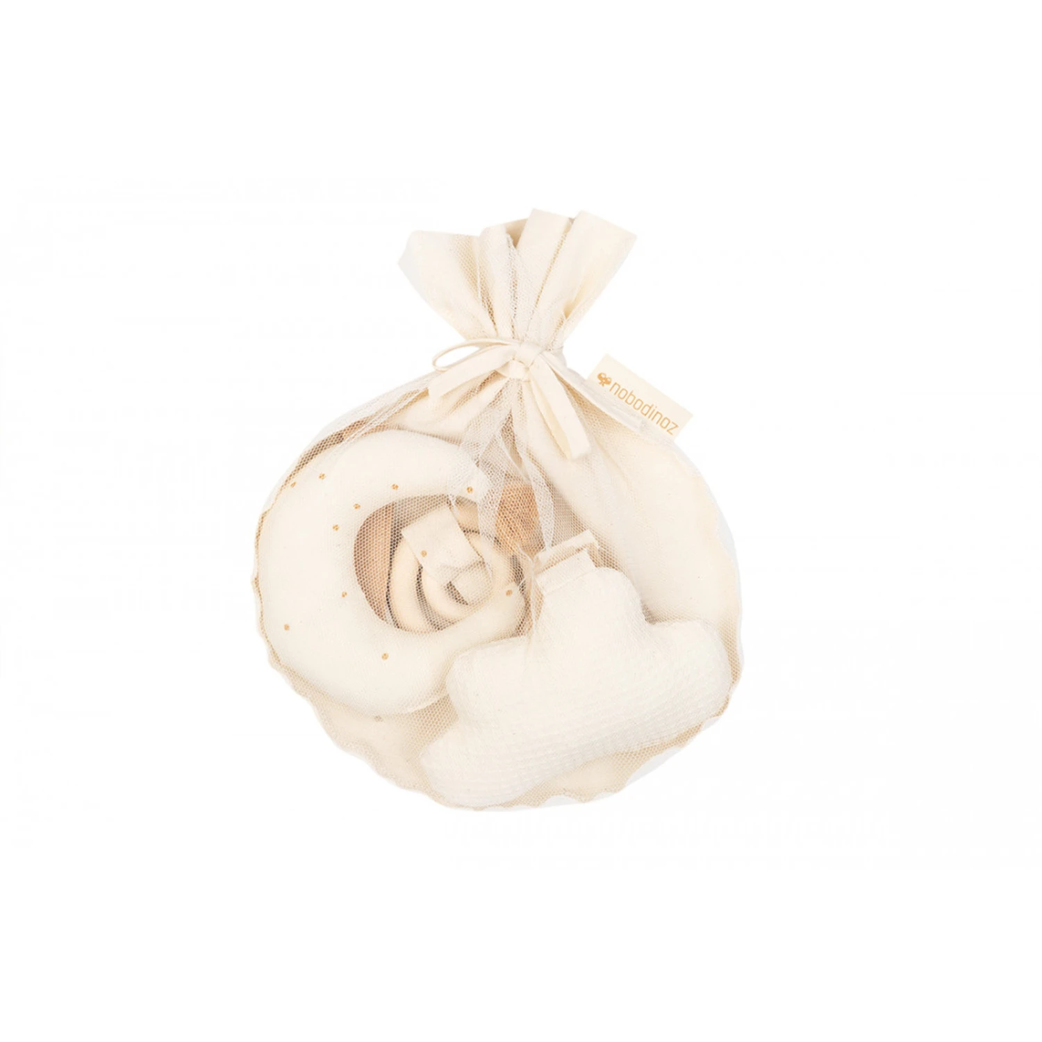 - Lot de 3 accessoires (hochet, anneau de dentition, papier crépitant)