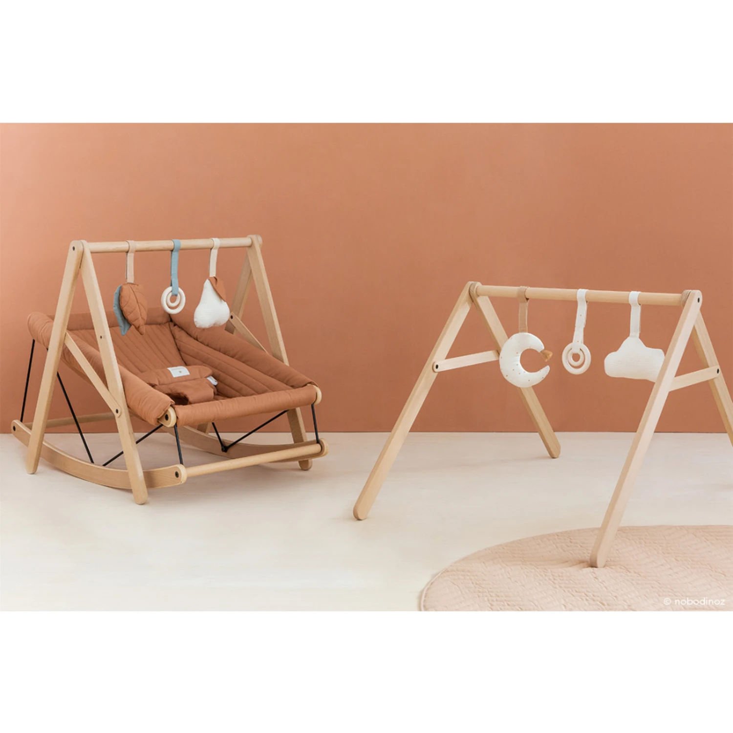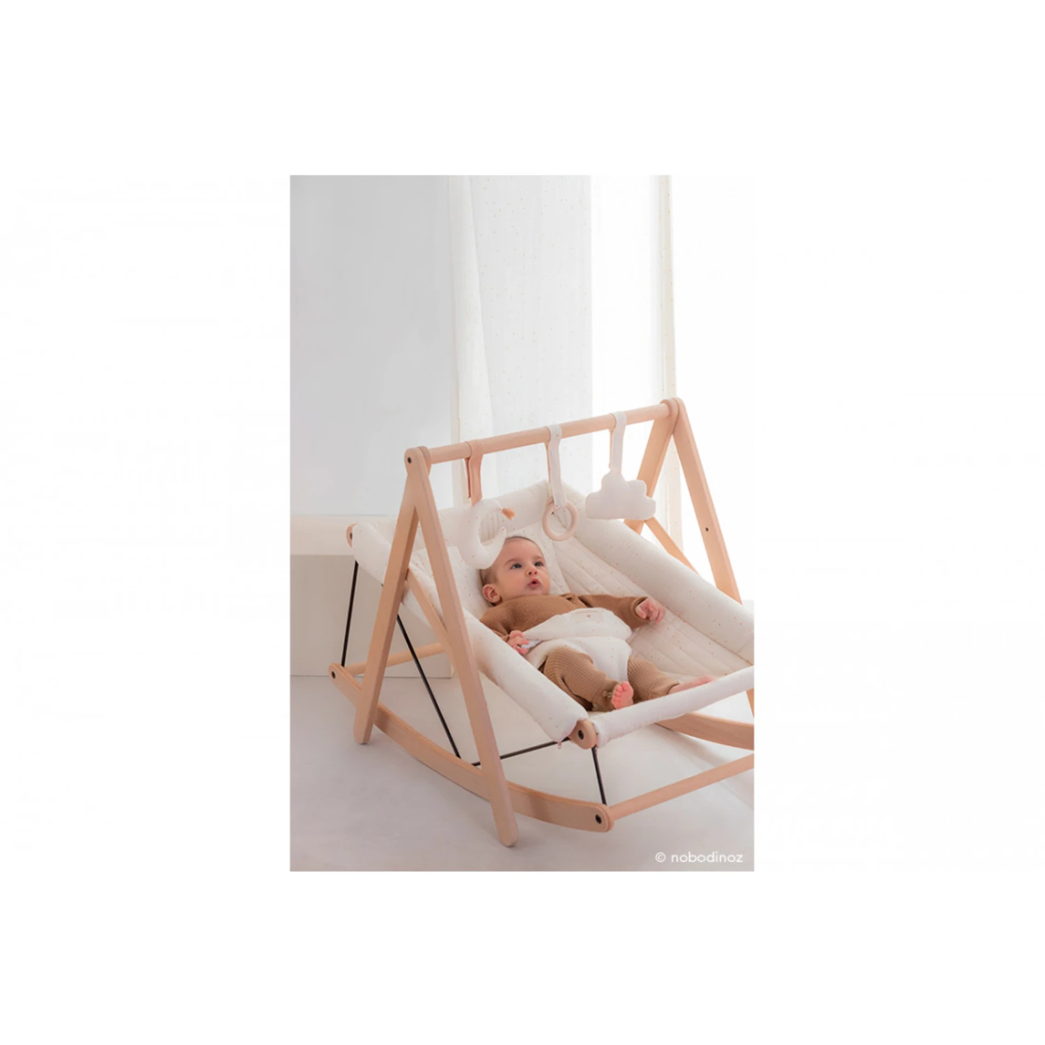 Cette jolie arche vous propose 2 positions : une position basse où l’arche se pose sur votre tapis d’éveil, et une position haute où l’arche surplombe à la perfection le Nobodinoz… Bébé pourra ainsi profiter d’un magnifique espace de jeu pour s’éveiller et développer sa motricité fine.