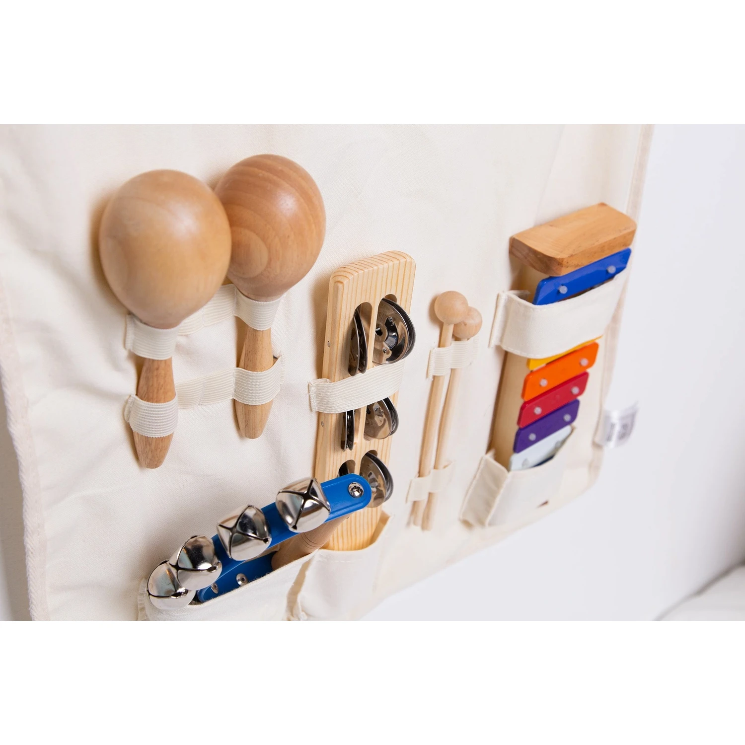 Childhome a également pensé aux parents en proposant le set musical dans un organisateur pliable ultra pratique. Il s’agit d’une toile facile à plier et à accrocher. Votre enfant dispose ainsi tous ses instruments et peut les ranger tranquillement après avoir joué.