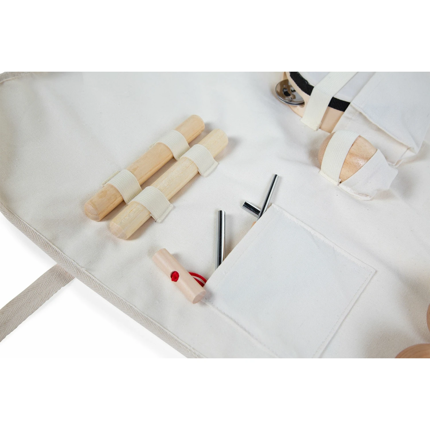 Le set musical se compose de 8 instruments : tambourin, claves, maracas, œufs secouants, xylophone, battant rythmique, triangle et cloche à main. Ils peuvent être utilisés pour tous les enfants à partir de 36 mois.
