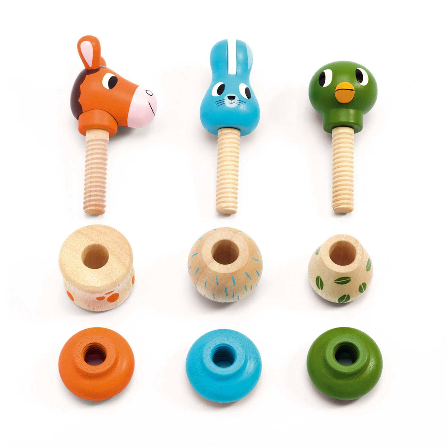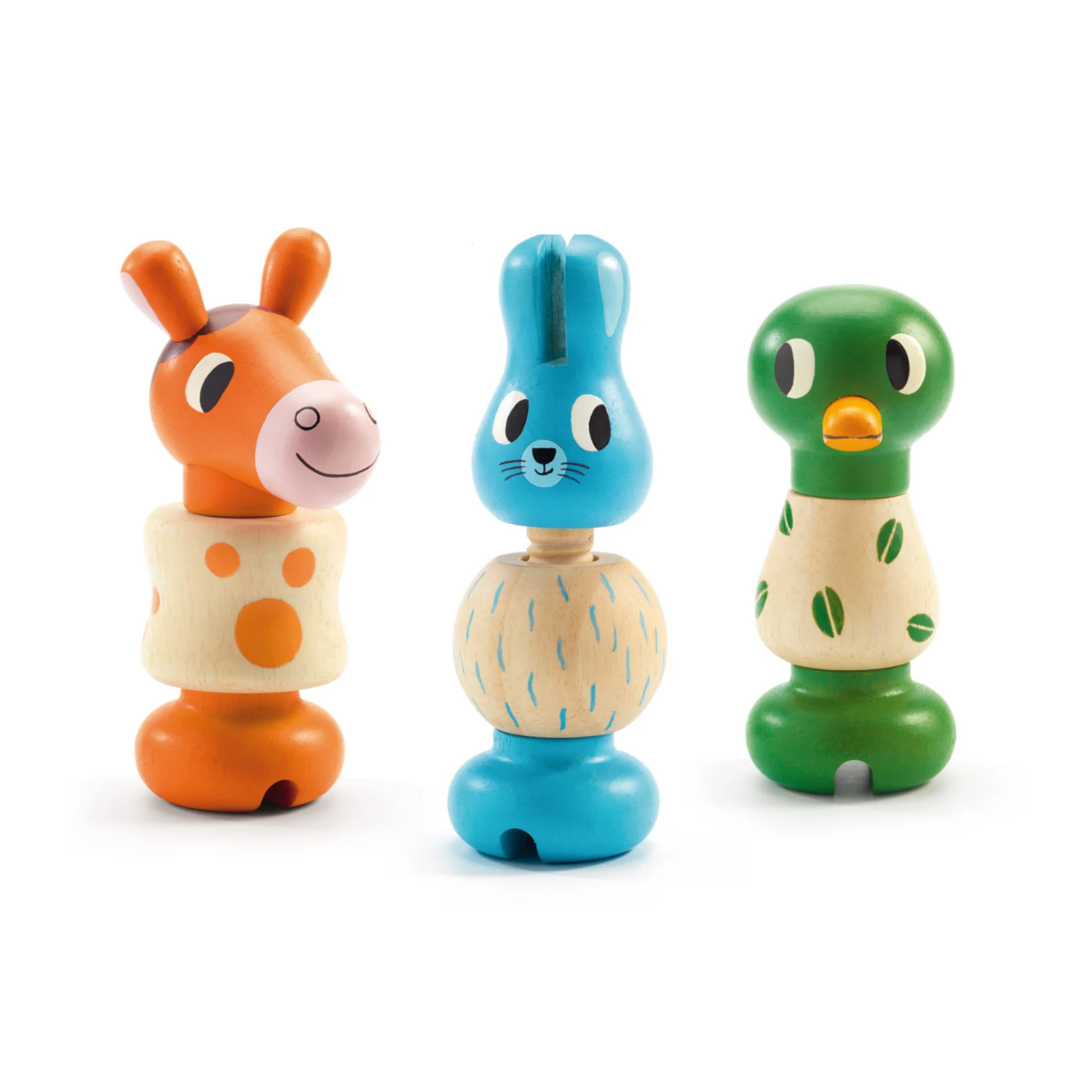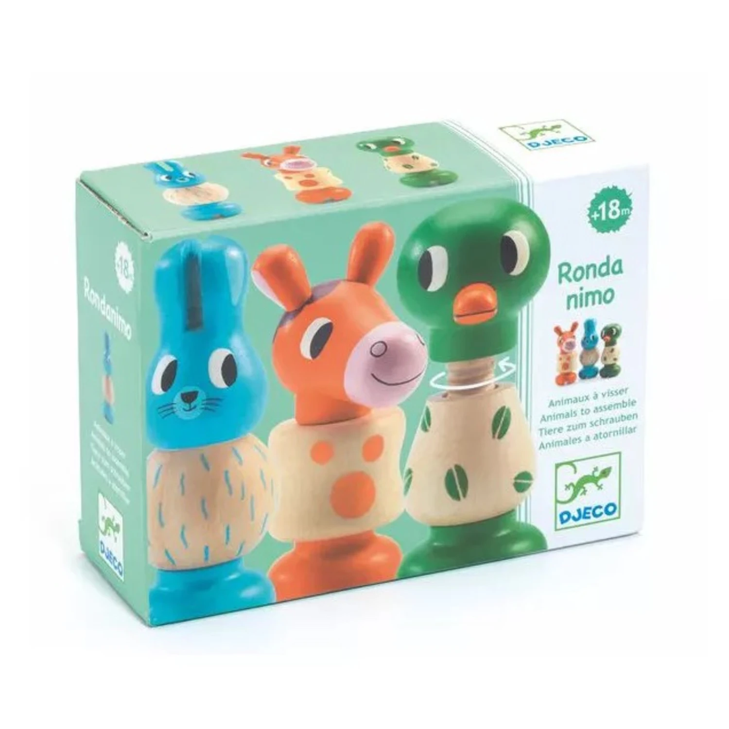 Découvrez ces jolis petits animaux colorés en bois à assembler de la marque ! Un jeu de manipulation composé de 3 animaux à visser et qui développera la dextérité de bébé dès 18 mois. Votre enfant ne manquera pas de s’amuser à visser et dévisser le corps, la tête et les jambes de ces drôles d’animaux (lapin, cheval, canard) ! Ce jeu comprend 9 pièces en bois adaptées aux petites mains des bébés.