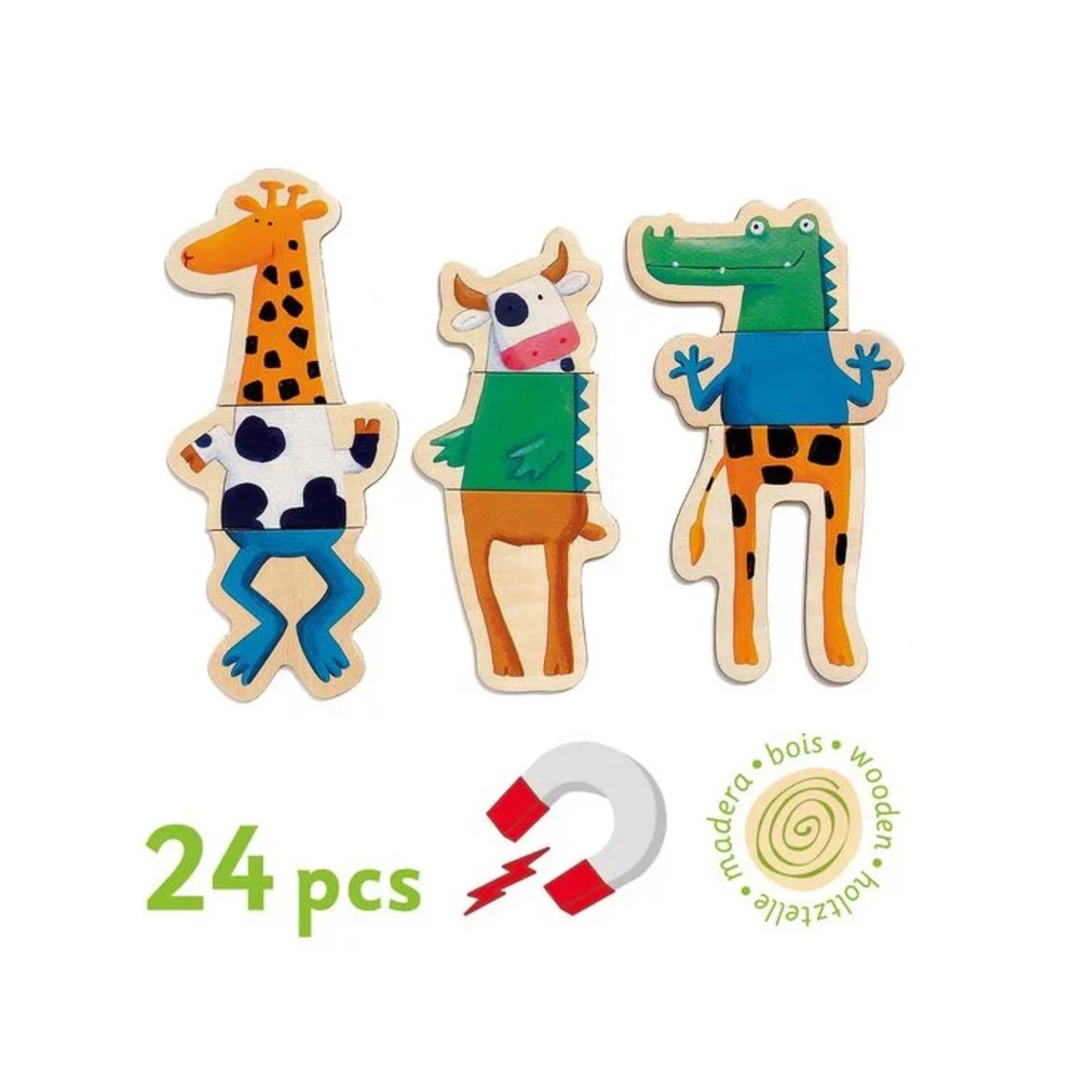 Un joli puzzle aimanté en bois mélangeant animaux et déguisements de la marque , facile à prendre en mains et à manipuler pour les tout petits ! Le but du jeu ? Créer 8 animaux de 3 pièces chacun en assemblant la tête, le corps et les pattes de chaque animal… Vache, crocodile, girafe, grenouille, loup… Autant de petits animaux qui ne manqueront pas d’émerveiller bébé ! Véritable activité ludique et éducative, ce puzzle développera la coordination et l’esprit créatif de votre bambin !