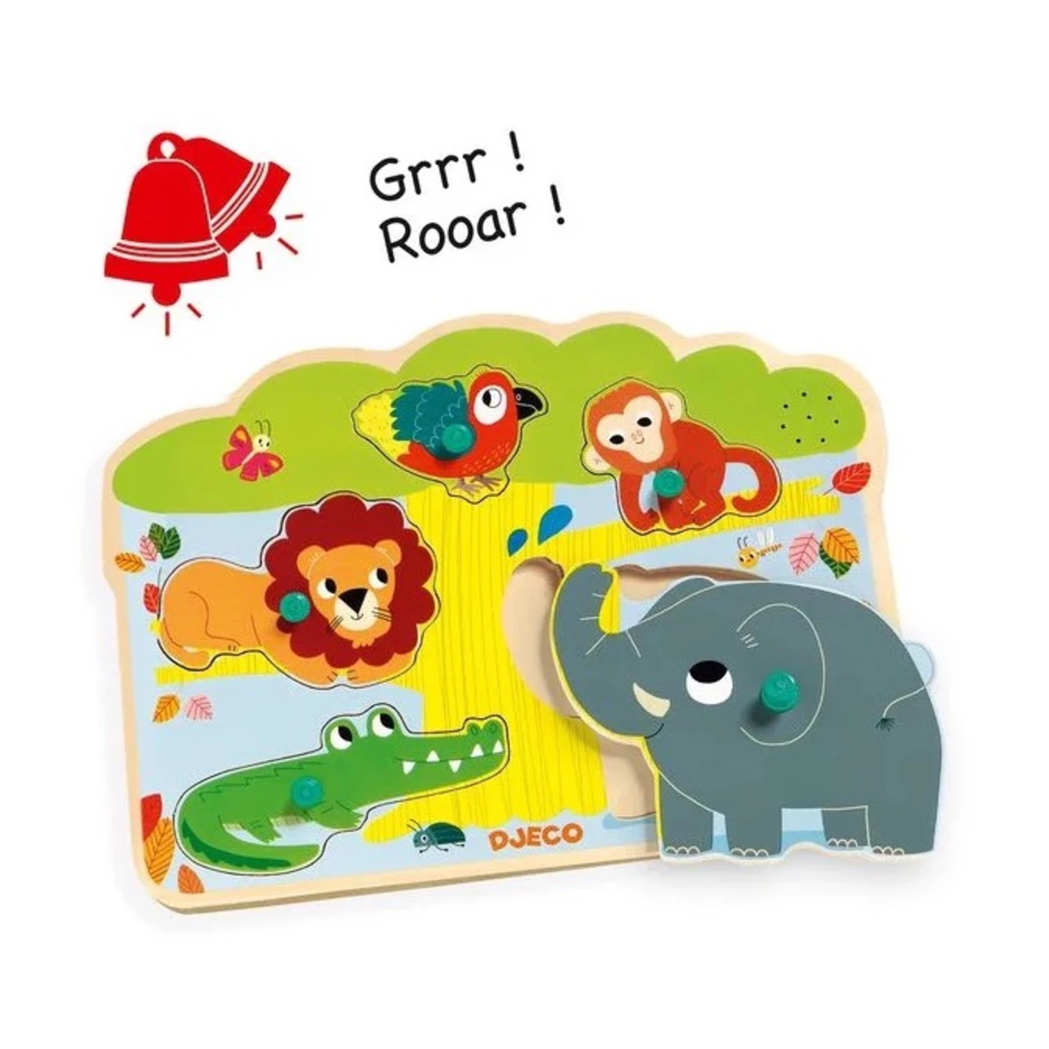 Découvrez le puzzle sonore en bois Baobab de la marque ! Un puzzle musical et coloré sur le thème des animaux de la savane pour les tout petits dès 1 an. Le but du jeu ? Replacer les animaux sur leur socle et écouter leurs cris. De quoi faire découvrir à votre bambin les bruits de l’éléphant, du singe, du perroquet, du lion et du crocodile…
