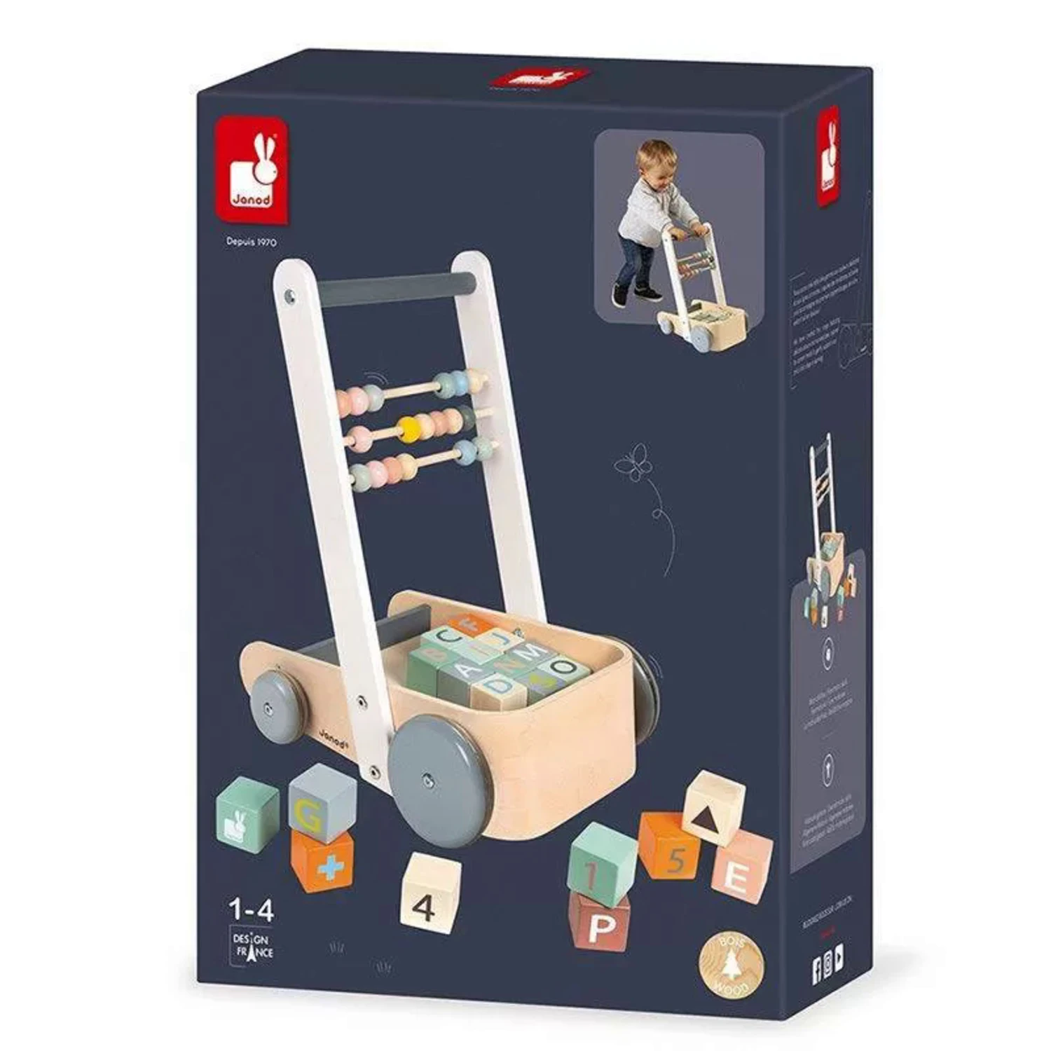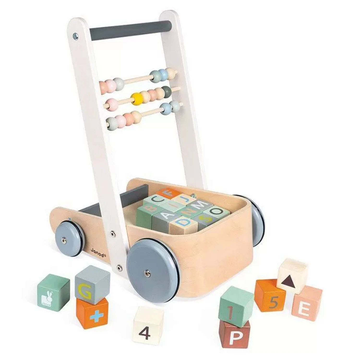Découvrez ce joli chariot de marche en bois aux couleurs tendres et actuelles de la marque que bébé pourra pousser en toute sécurité lorsqu’il apprendra à marcher ! Ce chariot d’éveil comprend 20 cubes imprimés recto/verso illustrant les lettres de l’alphabet, les chiffres et des formes simples. Il comprend également 3 rangées de boulier pour que votre petit(e) commence doucement à compter…