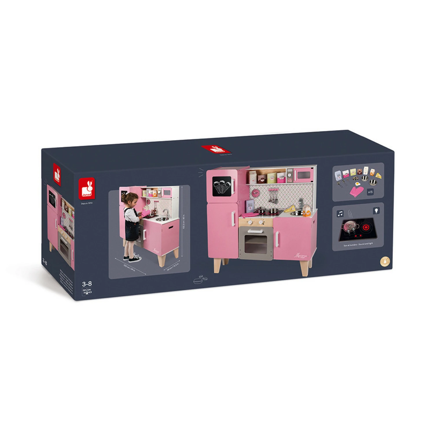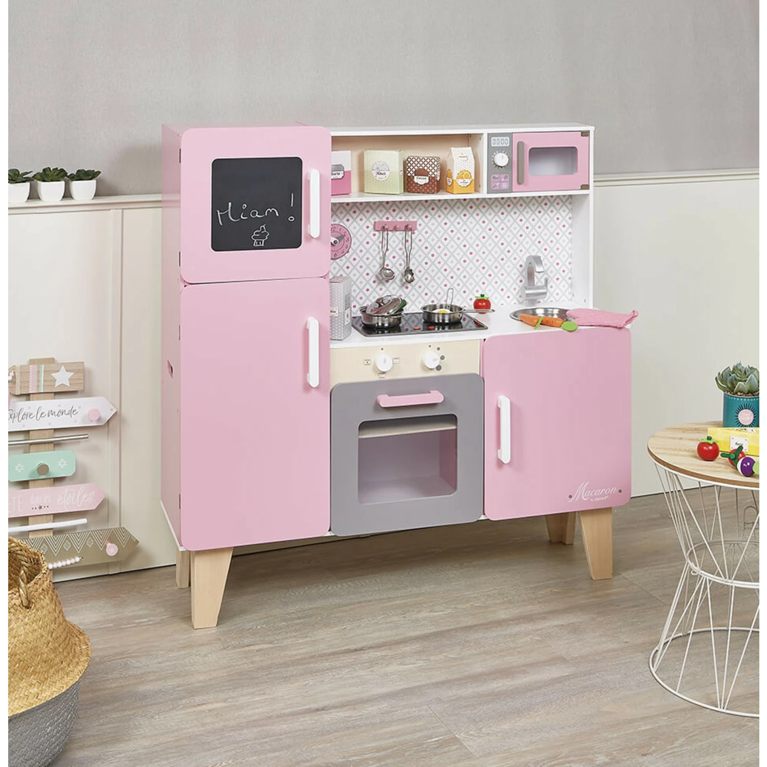Découvrez la maxi cuisine Macaron en bois de la marque , idéale pour cuisine de bons petits plats dès 3 ans ! Fabriquée en bois naturel, cette cuisine rose version XXL est équipée de nombreux accessoires : des cuillères en métal, une poêle, une casserole avec couvercle, un gant et 7 boîtes d’aliments (cacao, sucre, jus d’orange, farine, fromage, lait et riz). Plus vraie que nature, la plaque à induction sonore s’allume à l’aide de 2 boutons qui simulent le bruit de l’eau qui bout ! Cette grande cuisine toute équipée comprend également un four, un micro-ondes, un placard et un frigo avec portes magnétiques, un évier en inox, une horloge et une ardoise pour écrire la liste des courses.