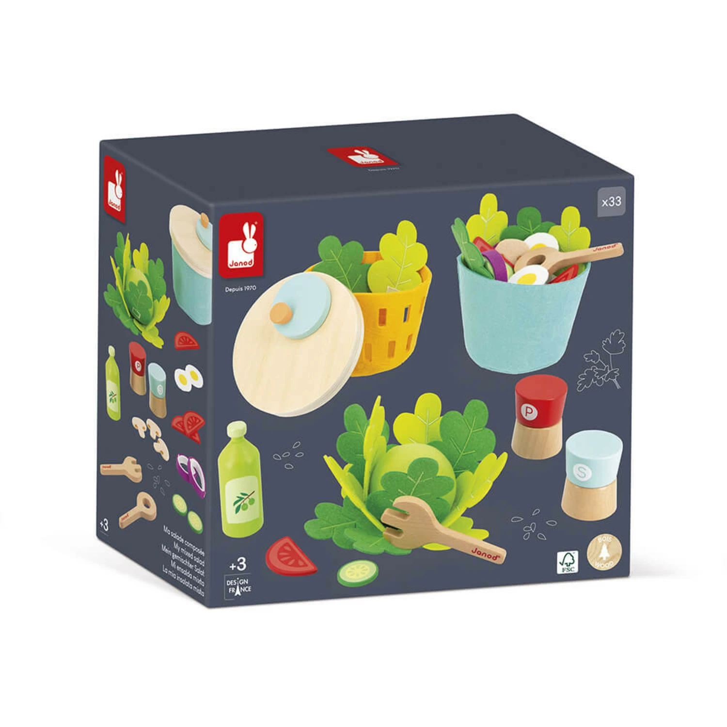 Découvrez la salade composée de la marque de jouets , composée d’une essoreuse à salade avec tous les ingrédients nécessaires et des couverts à salade pour préparer une salade gourmande et équilibrée. C’est le parfait pour compléter une cuisine pour enfant ou une dînette ! Tous les ingrédients sont réalisés en bois et en feutrine : 12 feuilles craquantes de salade, 3 tranches de tomate, 2 tranches de concombre, 2 œufs, 3 champignons et 2 oignons. Pour assaisonner le tout, le set comprend une bouteille d’huile d’olive, ainsi qu’une salière et une poivrière qui font du bruit quand on tourne la partie supérieure.