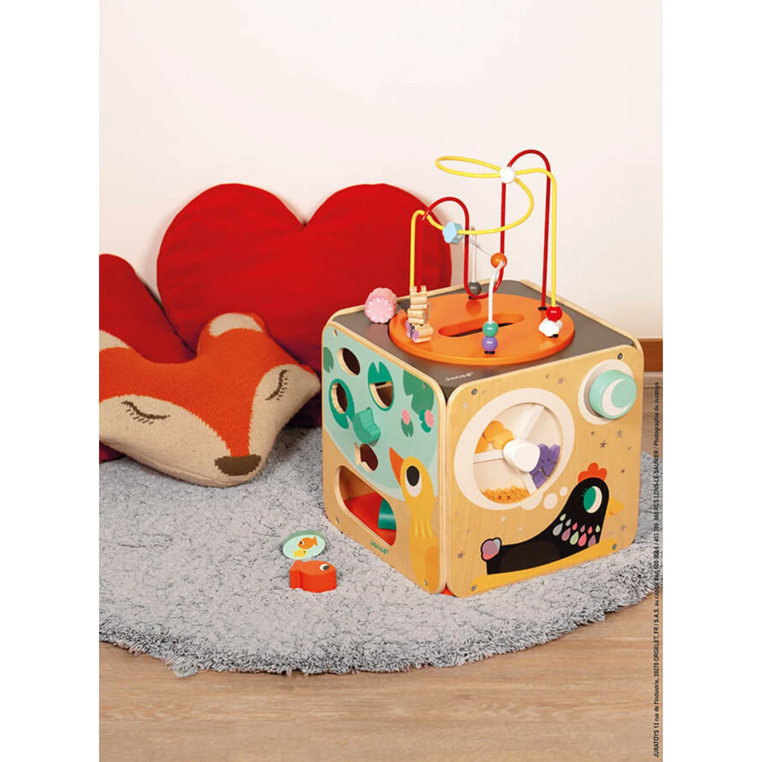 Optez pour ce maxi looping multi-activités en bois de la marque ! Ce looping comporte plusieurs activités pour divertir bébé : un moulin rempli d’œufs à tourner, un engrenage de 3 roues, un miroir, un labyrinthe, 5 pièces à encastrer et une chenille avec des anneaux qui tournent autour d’un axe et dévoilent une nouvelle couleur… Véritable jeu premier âge, ce maxi looping stimule l’ouïe, la concentration et la motricité des plus petits. Pour un rangement plus facile, le looping se retourne à l’intérieur du cube.