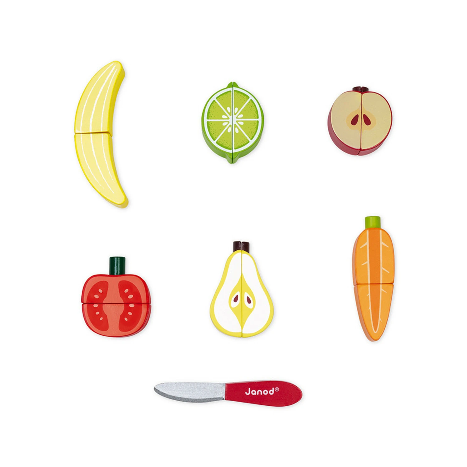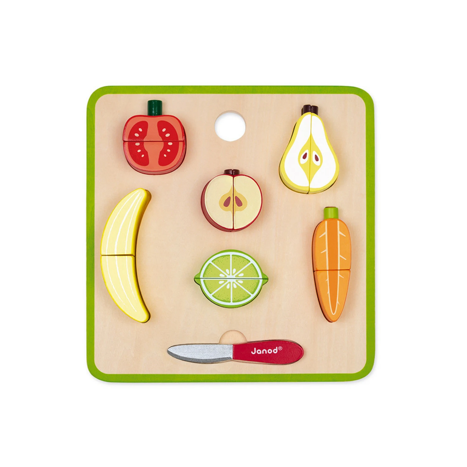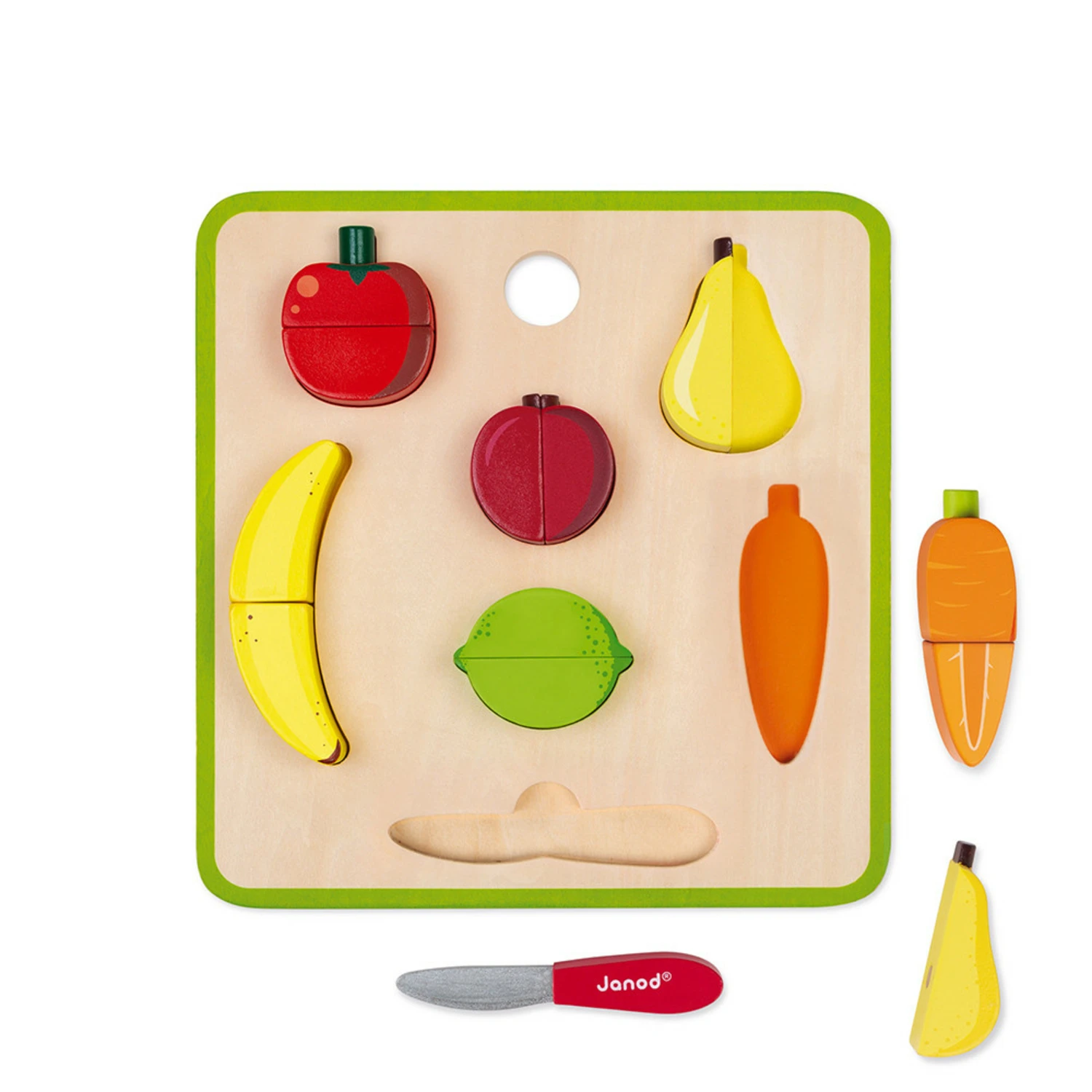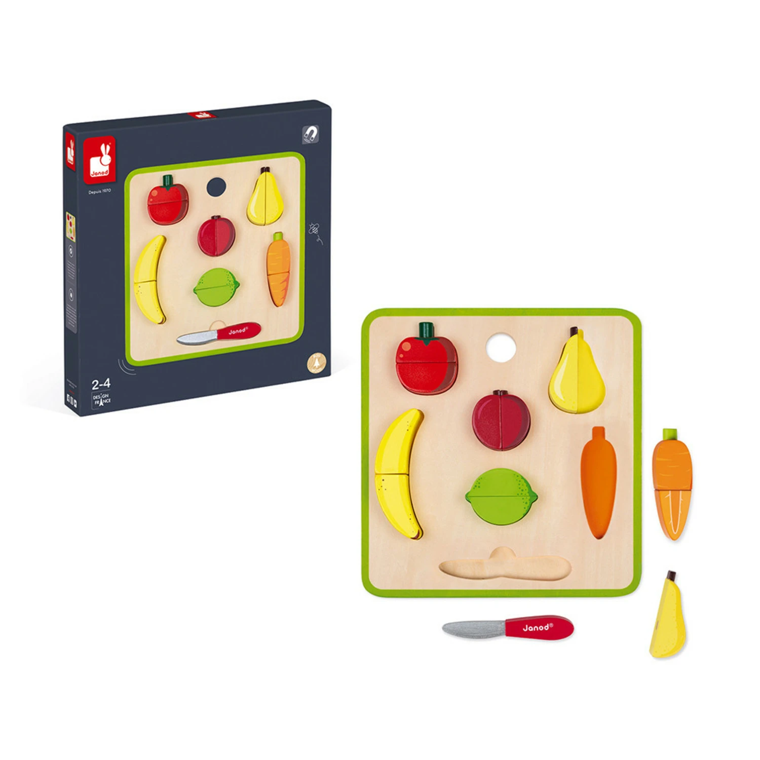 Un puzzle Fruits et Légume magnétique de la marque pour couper et éplucher les fruits et légumes comme les grands ! Réversible et magnétique, ce plateau comprend un côté puzzle et un côté planche à découper et permet d’assembler et découper les aliments à l’infini… De quoi développer la motricité fine des plus petits ! Le plateau contient 7 pièces : une tomate, une carotte, une poire, une pomme, une banane, un citron et un couteau.