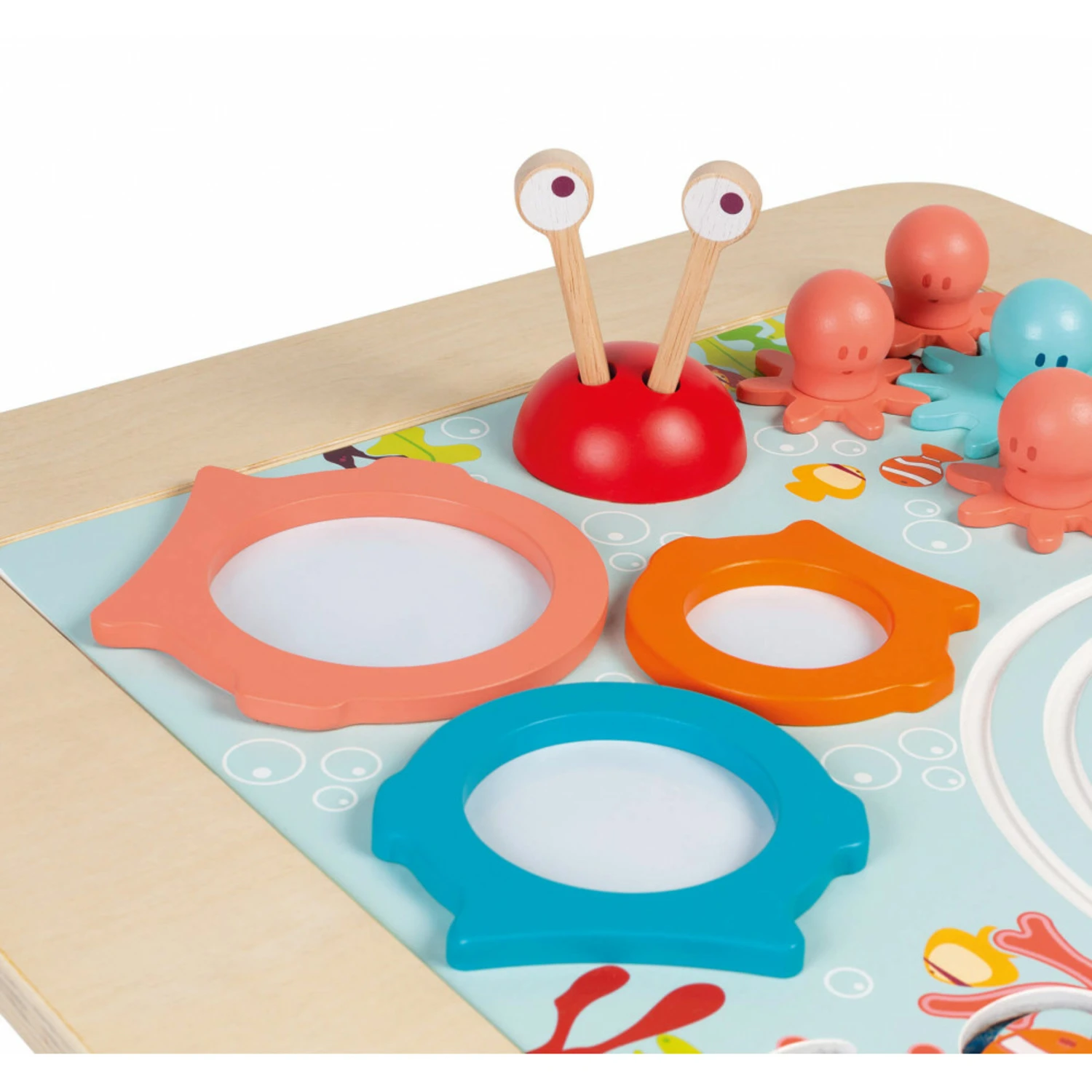 Découvrez la superbe table multi-activités Evolutive en bois de la marque ! Incontournable, cette jolie table astucieuse aux couleurs douces offre à bébé la possibilité de découvrir de nouveaux jeux premier âge. La table se compose de plusieurs activités : un jeu d’engrenage avec des petites pieuvres rigolotes, un choix de 3 tambours en forme de poisson, un poisson à faire glisser, un circuit avec un bateau à déplacer et un phare à assembler. De quoi faire voyage bébé de découverte en découverte…