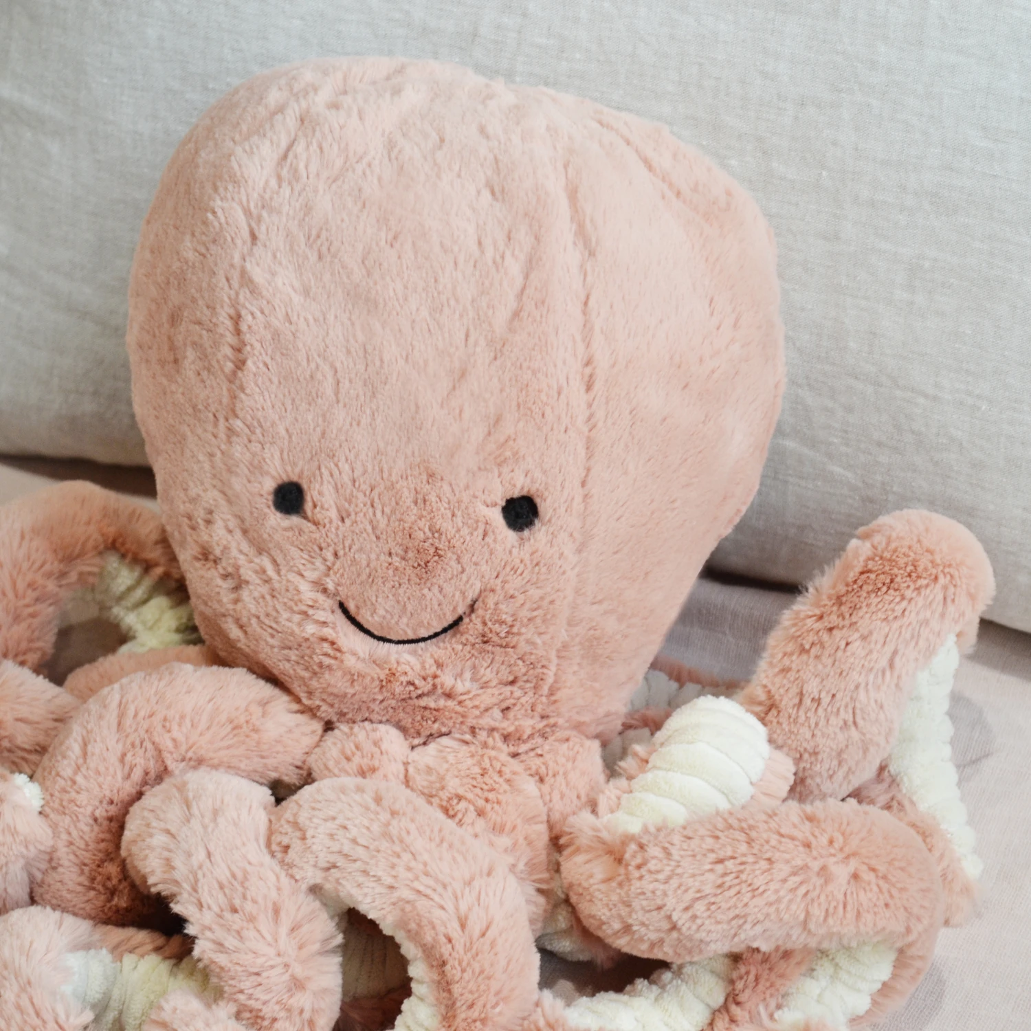 vous présente l’adorable peluche Octopus Odell ! Avec ses nombreuses tentacules, la pieuvre Odell est prête à faire de gros câlins à votre petit trésor. Une pieuvre réconfortante et ultra douce pour la journée ou pour les nuits de bébé. Les petites tentacules de ce poulpe rose poudré sont facilement préhensibles par les petites mains délicates de votre enfant. Il paraitrait même que ses tentacules auraient un pouvoir apaisant sur bébé car elles lui rappelleraient le cordon ombilical dans le ventre de sa maman…