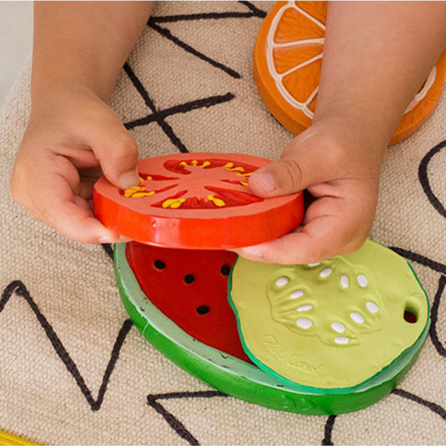Avec sa forme atypique et ses jolies couleurs, cette tomate souple et flexible ne manquera pas de stimuler les sens de votre enfant, tout en apaisant ses petites gencives douloureuses !
