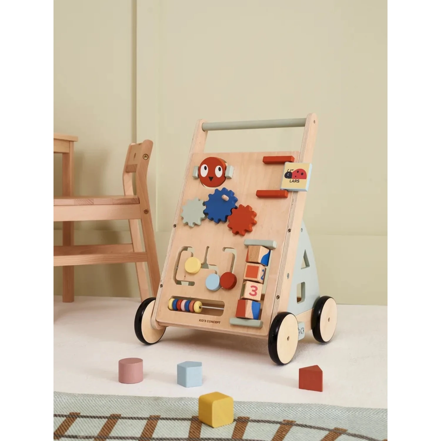 Un chariot multi-activités pour apprendre à marcher signé , dont le tableau d’activités est amovible pour pouvoir l’utiliser sur un tapis de jeu ou sur une table. C’est un excellent moyen pour les plus petits d’exercer leur muscles et leur équilibre. Les différentes activités du tableau permettent aux enfants de pratiquer leur motricité fine et la résolution de problèmes. Les roues avant sont équipées de freins, vous pouvez donc réguler la vitesse.