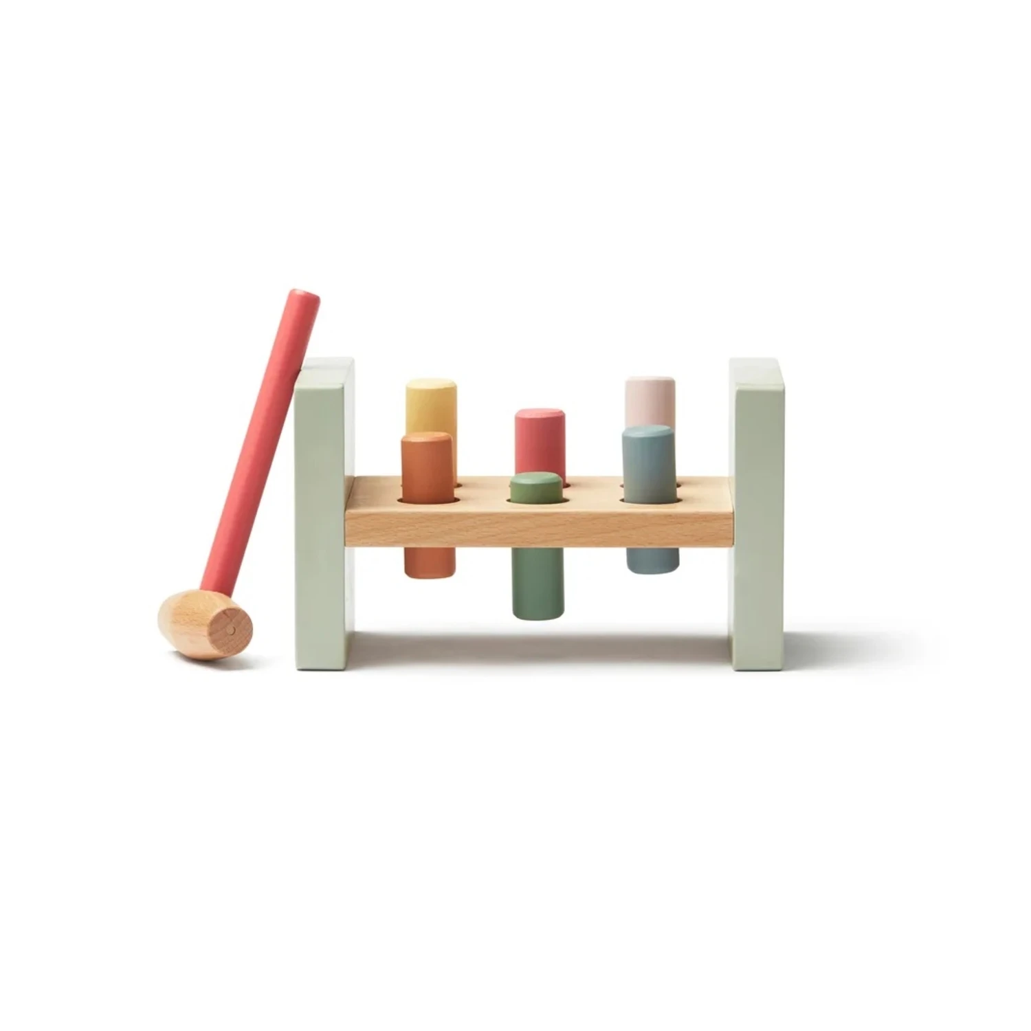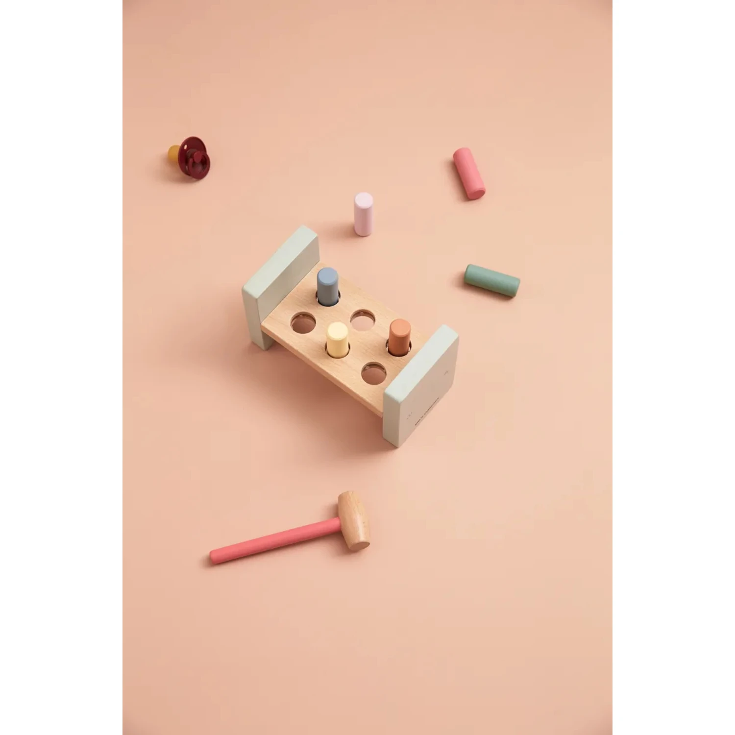 Découvrez ce joli jeu de marteau Edvin de la marque scandinave , entièrement fabriqué en bois naturel et peint à l’eau. Véritable activité éducative et divertissante pour les tout petits ! Ce jeu se compose d’un banc, de 6 chevilles colorés et d’un marteau.