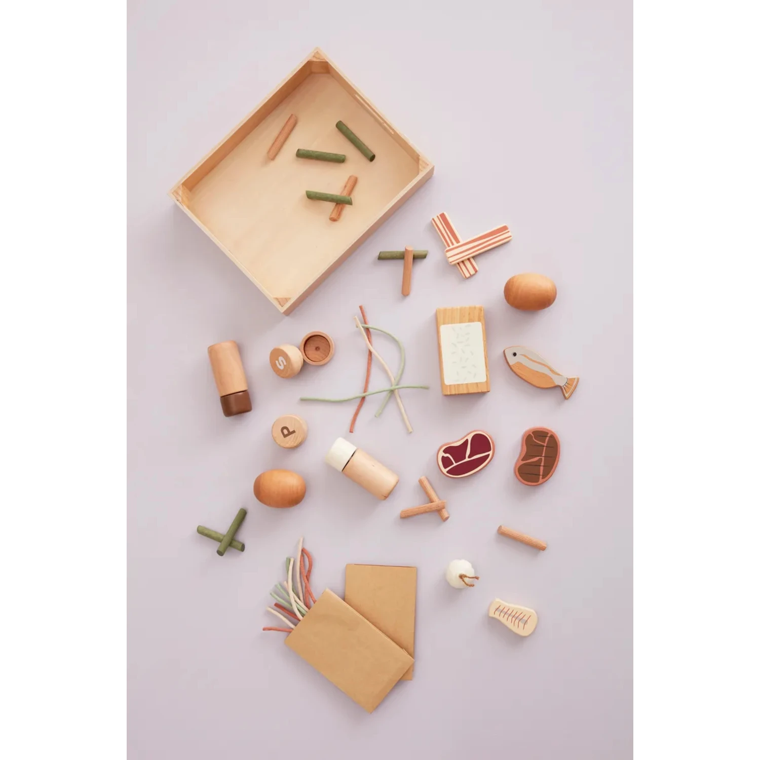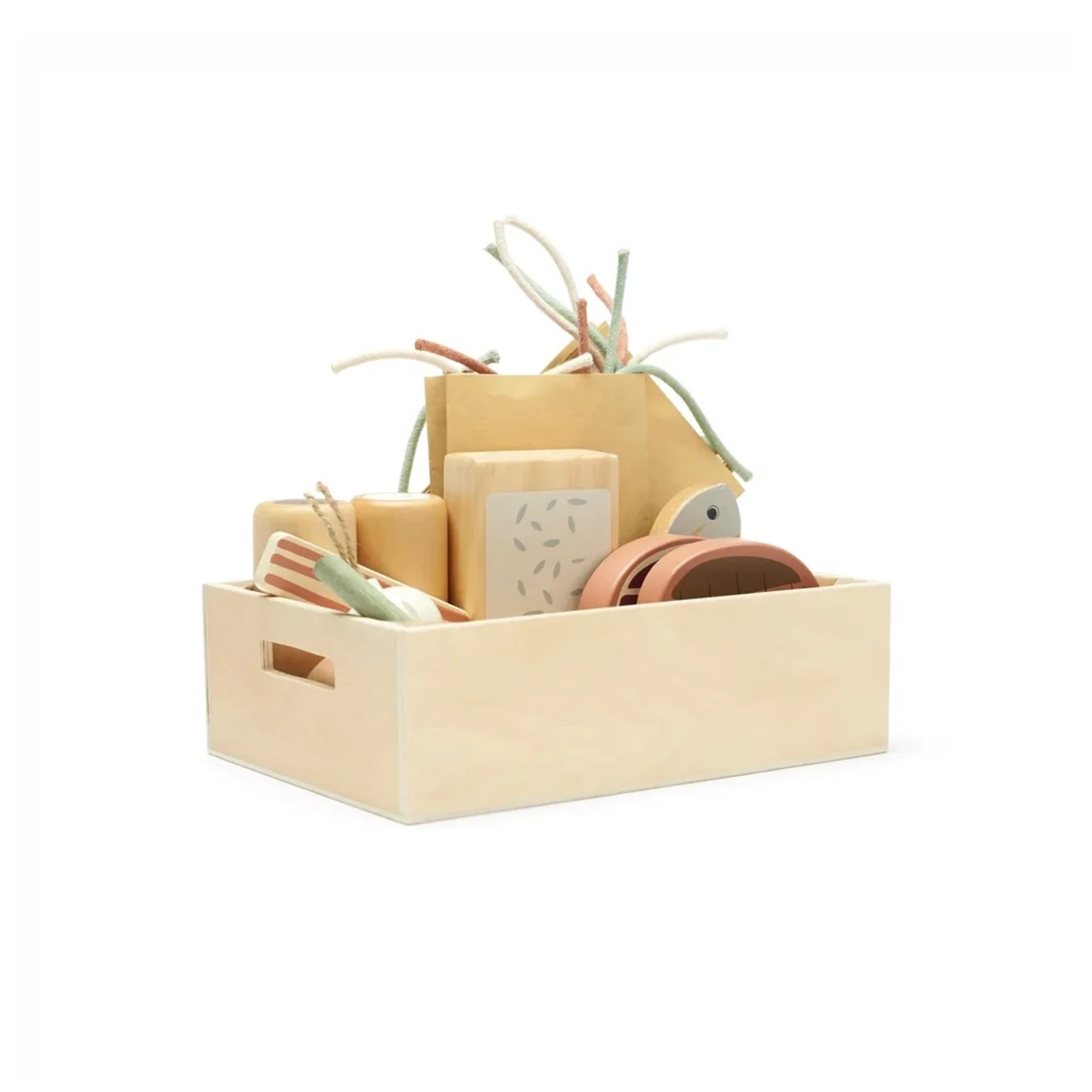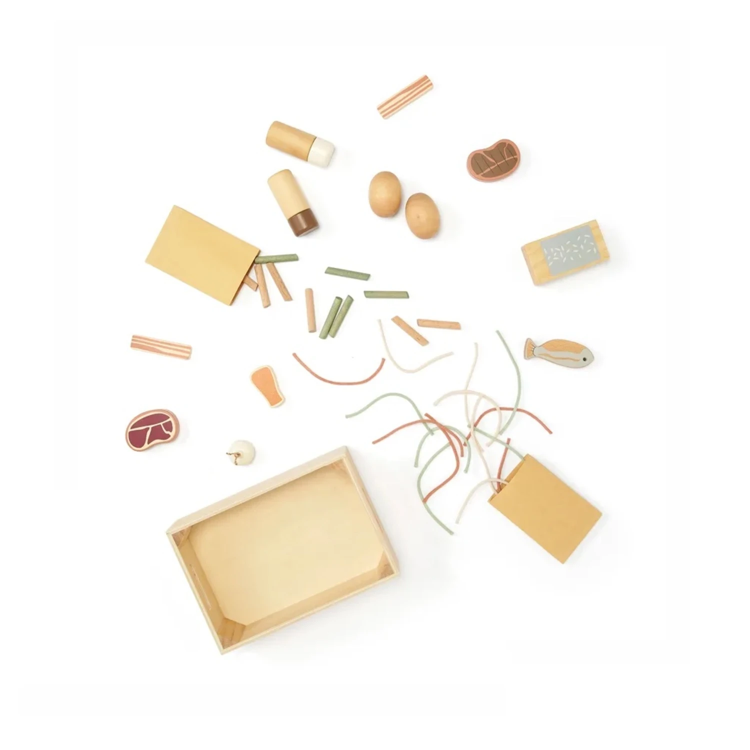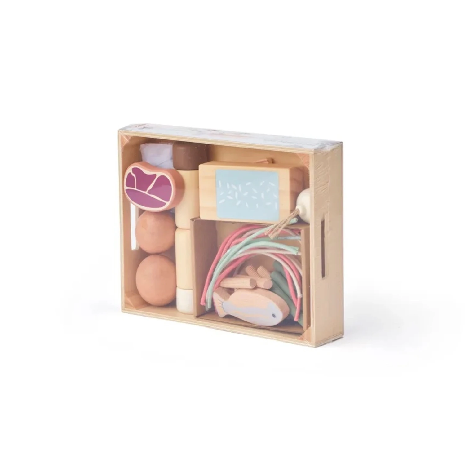 Découvrez le superbe panier de nourriture de la marque suédoise , un ensemble d’accessoires en bois pour jouer au chef cuisinier, pour ouvrir un magasin ou encore son propre restaurant ! Le set comprend : des pâtes, du riz, 2 pommes de terre, 6 haricots verts, 1 gousse d’ail, de la viande, du poisson… Il y a également une salière et une poivrière qui cliquent lorsqu’on les tourne. Tous les accessoires sont livrés dans une jolie caisse en bois.