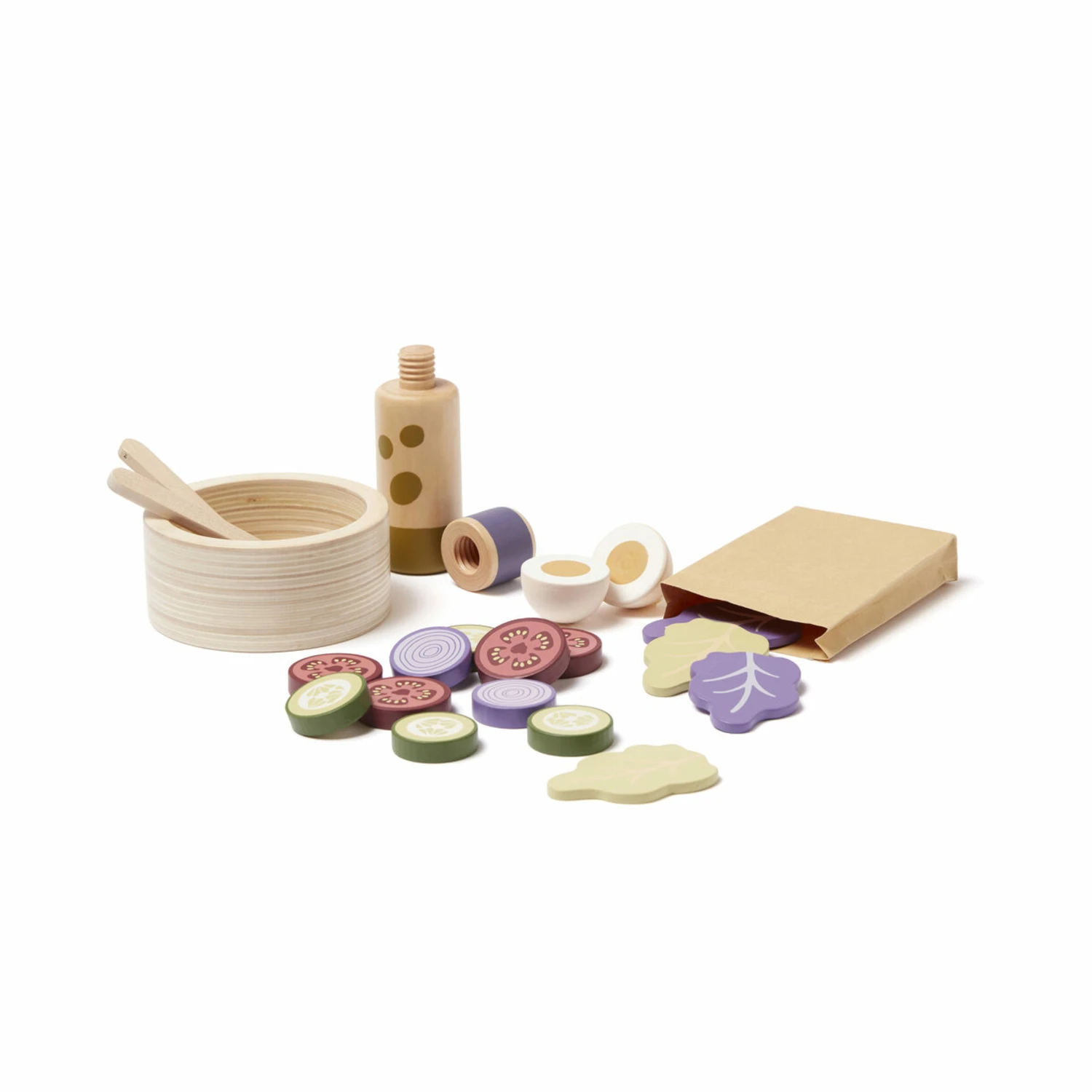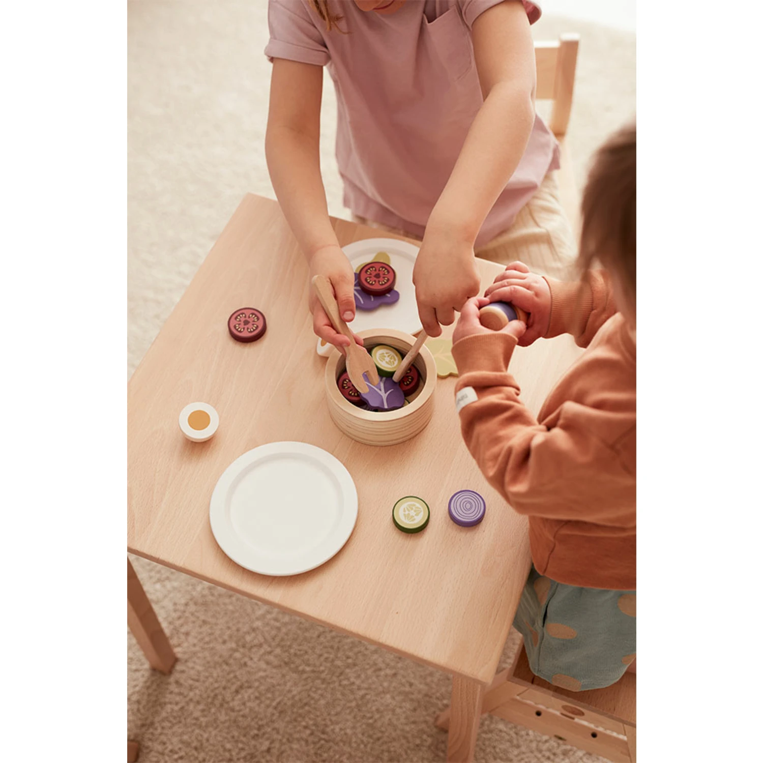 Découvrez le beau service à salade en bois de la marque suédoise , idéal pour jouer au chef cuisinier ! Cet ensemble en bois contient 21 pièces : des œufs, des feuilles de salade, 4 tomates, 4 rondelles de concombre, 2 tranches d’oignon rouge, une bouteille d’huile d’olive, un saladier et des couverts… Le set à salade en bois Kid’s Concept est le parfait jeu d’imitation pour que vos minis prennent goût à la cuisine et apprennent à préparer de bons petits plats équilibrés !