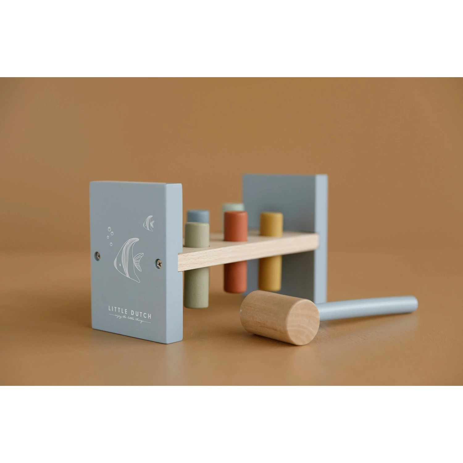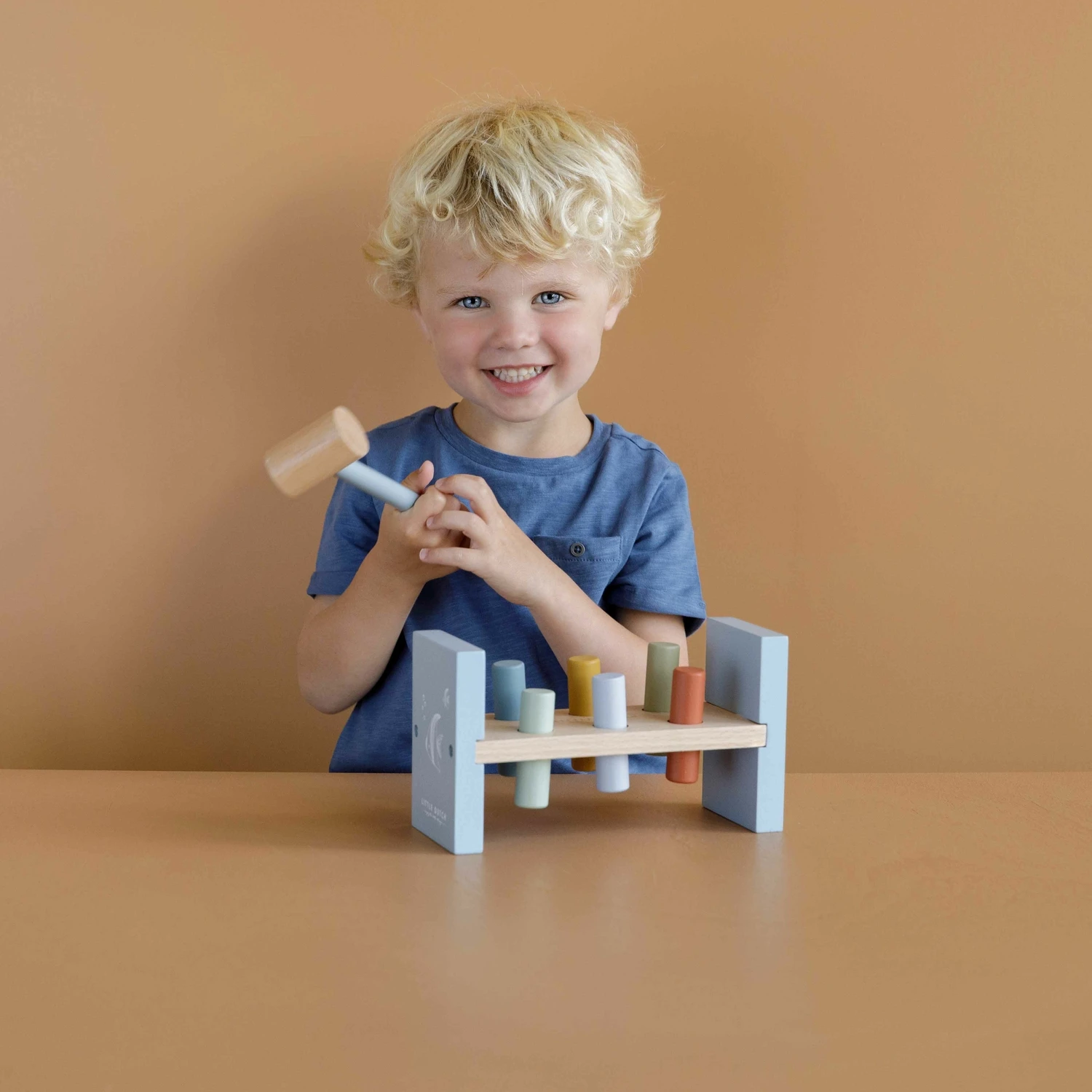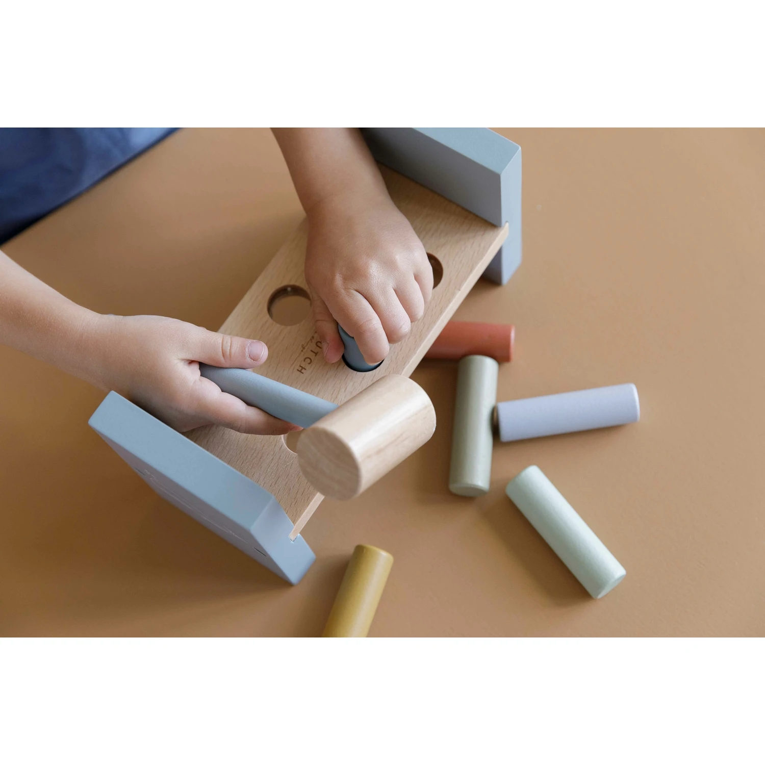 Toc, toc, toc ! Découvrez le banc à marteler en bois de la marque scandinave , entièrement fabriqué en bois naturel et peint à l’eau. Ce beau sera une excellente activité éducative et divertissante pour votre tout petit ! Le but du jeu ? Taper avec le marteau pour enfoncer les 6 bâtonnets dans l’établi, un bon exercice pour développer la motricité de votre enfant. Le banc se compose de 6 chevilles colorées et d’un marteau.