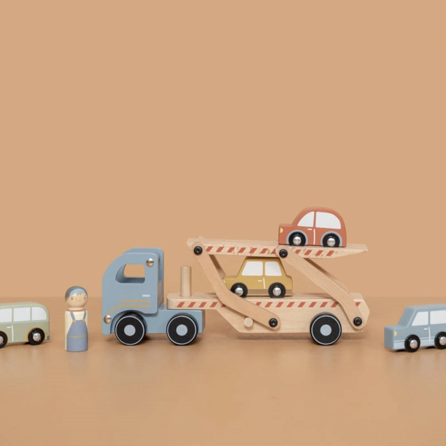 Découvrez le camion transporteur en bois de la marque et ses 4 petites voitures aux couleurs douces. Avec sa grande remorque amovible, ce camion ne passera pas inaperçu et fera le bonheur de tous les fans de voitures ! La remorque se déplie pour permettre à votre enfant de faire descendre les voitures et les faire rouler au sol.