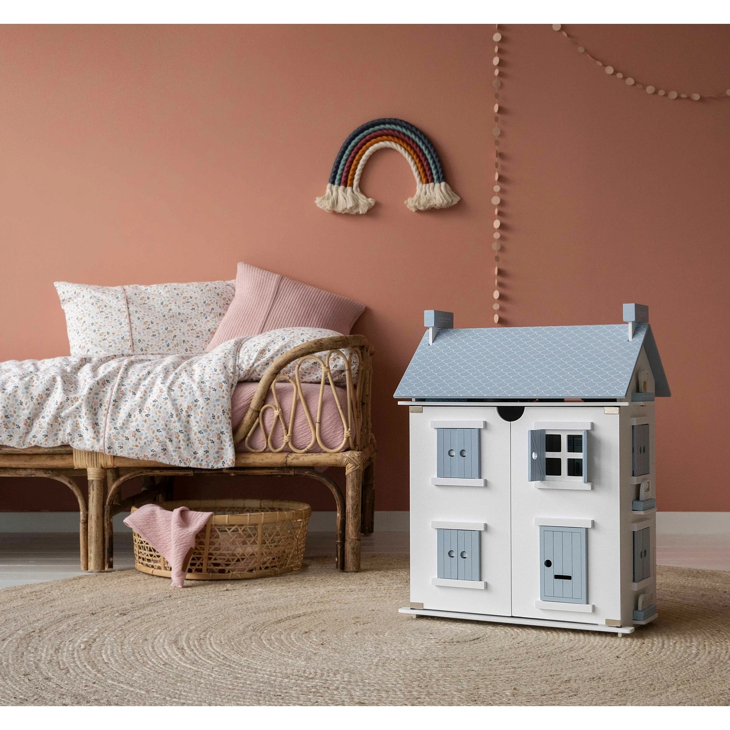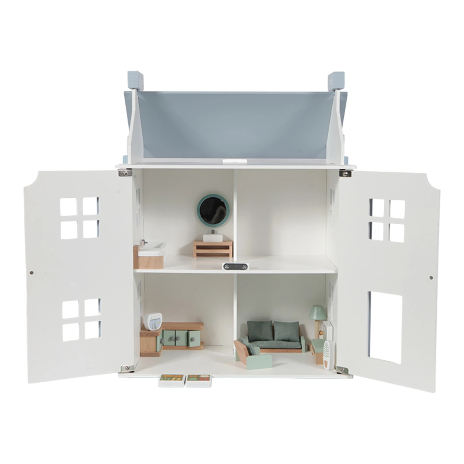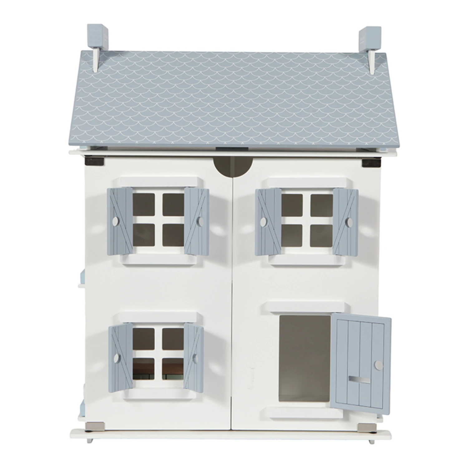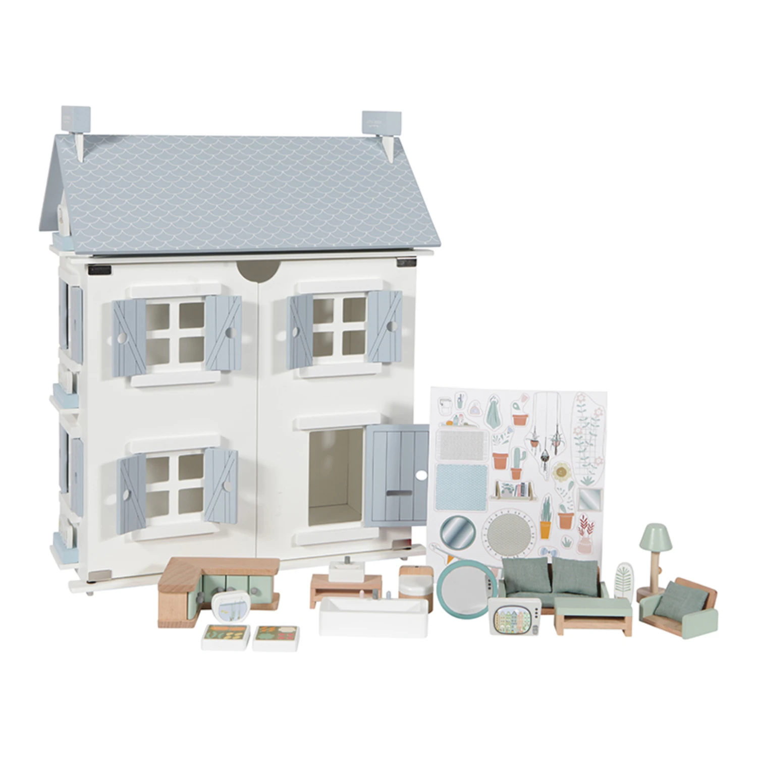 Découvrez la maison de poupée en bois de la marque dont le design moderne et épuré ne manquera pas de séduire petits et grands ! Cette belle maison est dotée de petits volets bleus et d’un toit démontable qui laisse apparaître le grenier… Cet ensemble de jeu comprend 18 accessoires (table, coussins, lampe, armoire, télévision, lavabo, miroir…) et 1 planche d’autocollants pour que votre enfant puisse habiller sa maison à son goût !