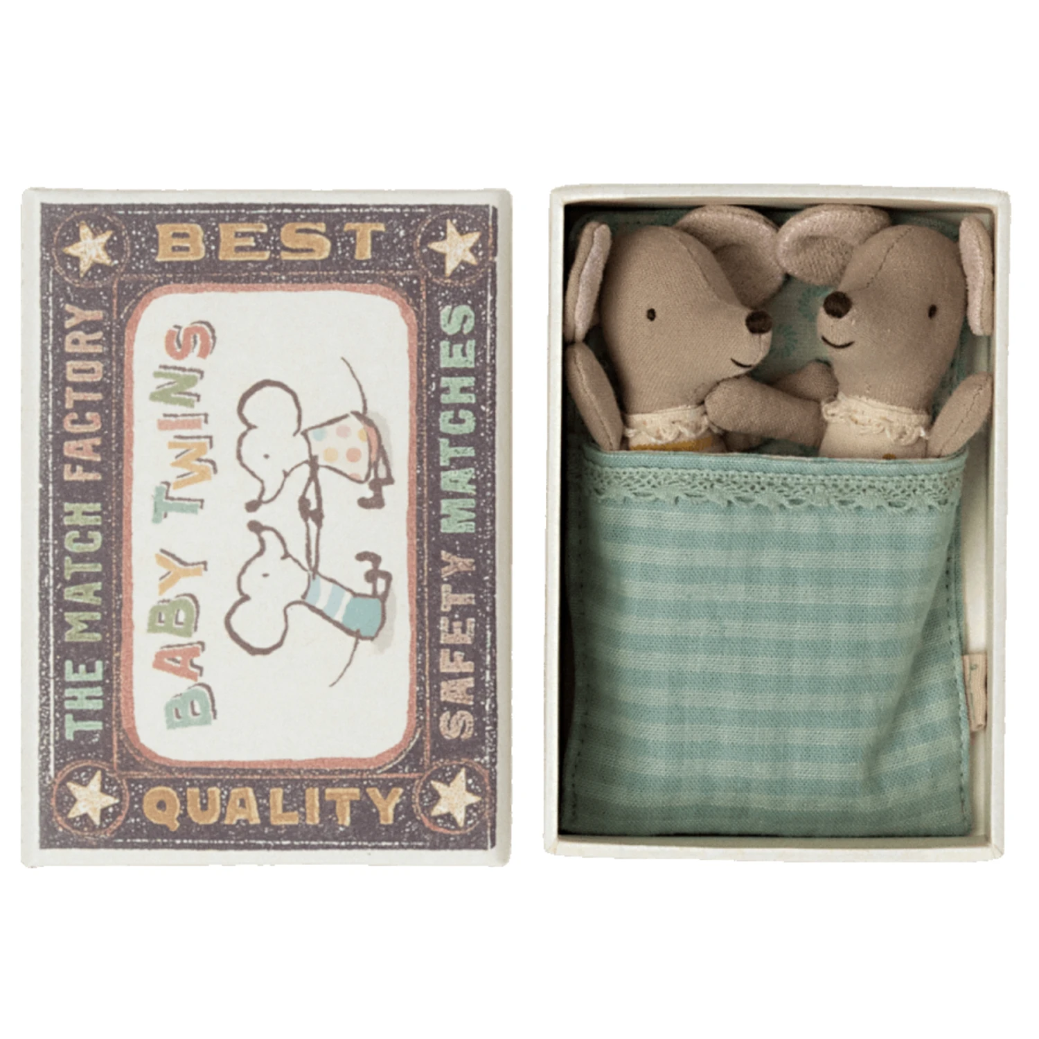 vous présente deux adorables souris jumelles dans leur boîte en carton… Avec ces petites souris, Maileg vous invite dans son univers poétique, haut en couleurs. Les enfants comme leurs parents laisseront aller leur imagination au travers d’histoires mêlant petites souris, hippopotames, éléphants ou encore lapins…