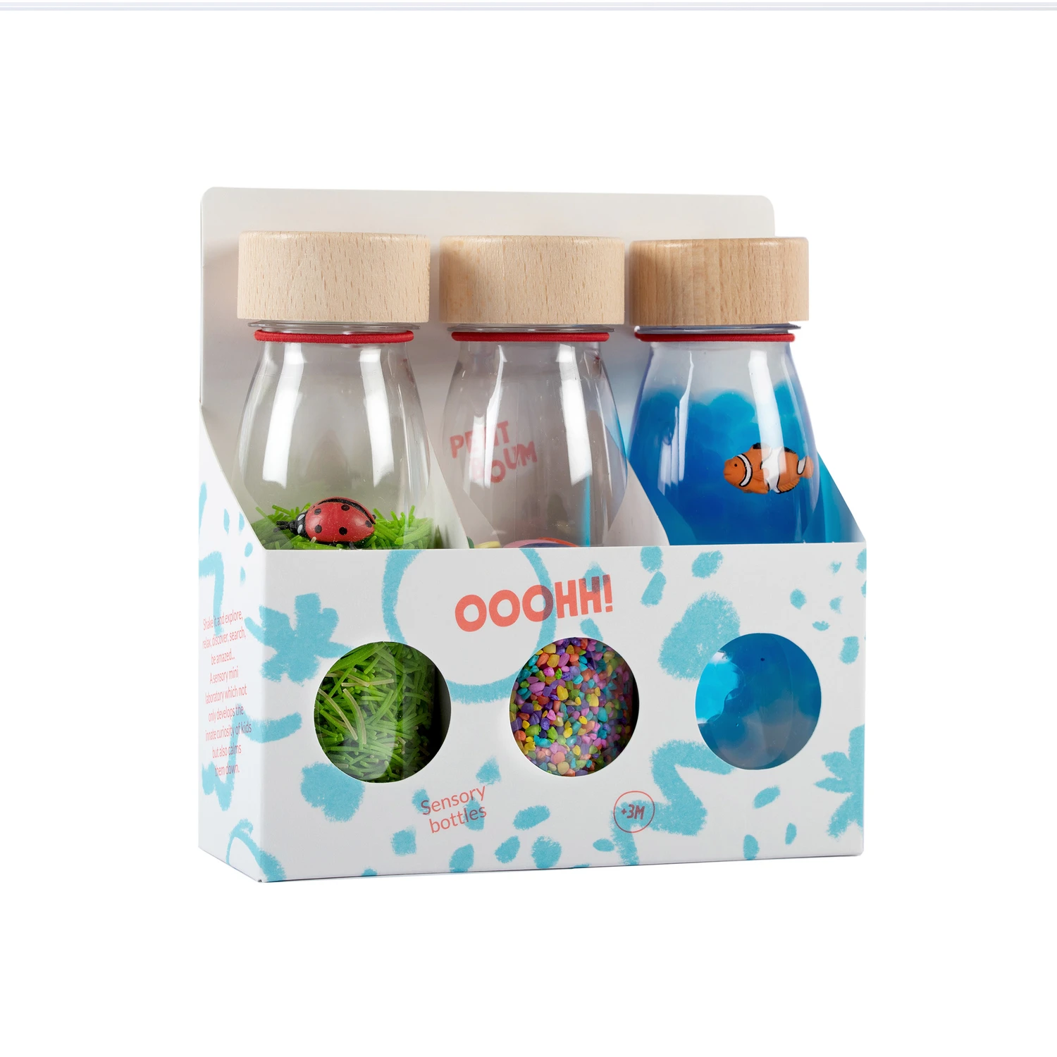 Optez pour le pack de 3 bouteilles sensorielles Eco de la marque , des petites bouteilles d’éveil à contempler et à écouter sans modération pour développer ses sens, son imagination et sa créativité dès 18 mois ! Les petites figurines contenues à l’intérieur des bouteilles ne manqueront pas de développer l’imaginaire de vos enfants qui s’amuseront à inventer de jolies histoires…