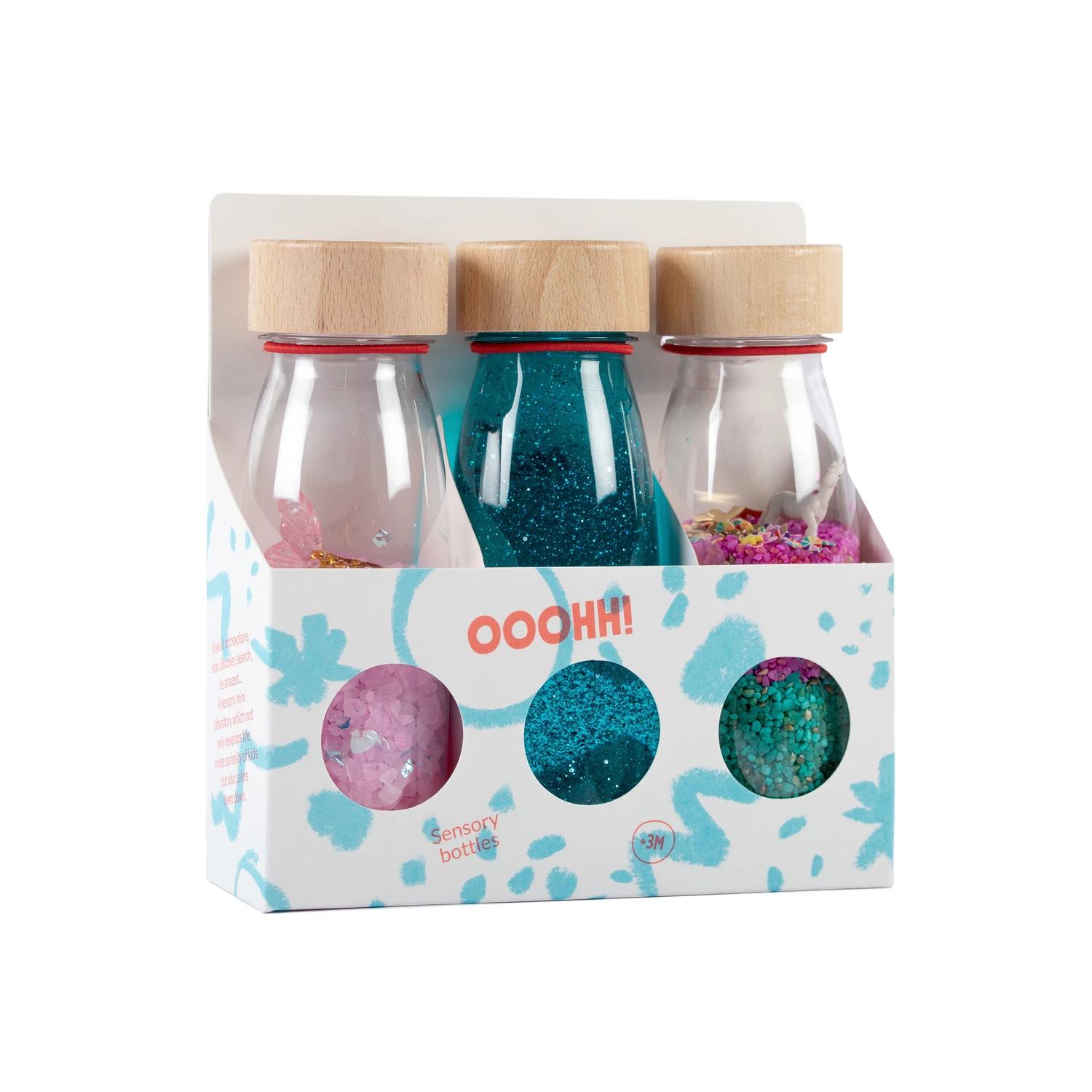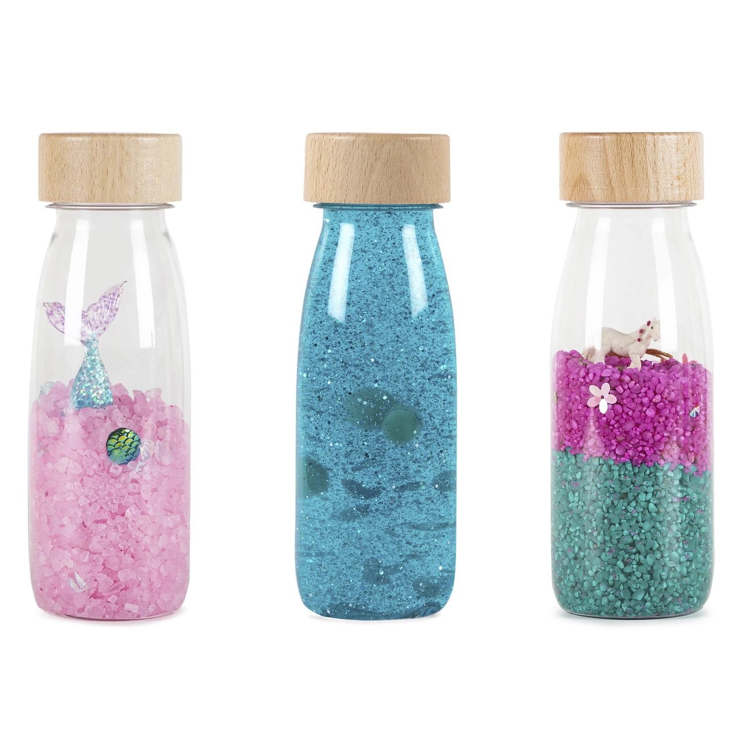 Optez pour le pack de 3 bouteilles sensorielles Fantasy de la marque , des petites bouteilles d’éveil à contempler et à écouter sans modération pour développer ses sens, son imagination et sa créativité dès 18 mois ! Les petites figurines contenues à l’intérieur des bouteilles ne manqueront pas de développer l’imaginaire de vos enfants qui s’amuseront à inventer de jolies histoires…