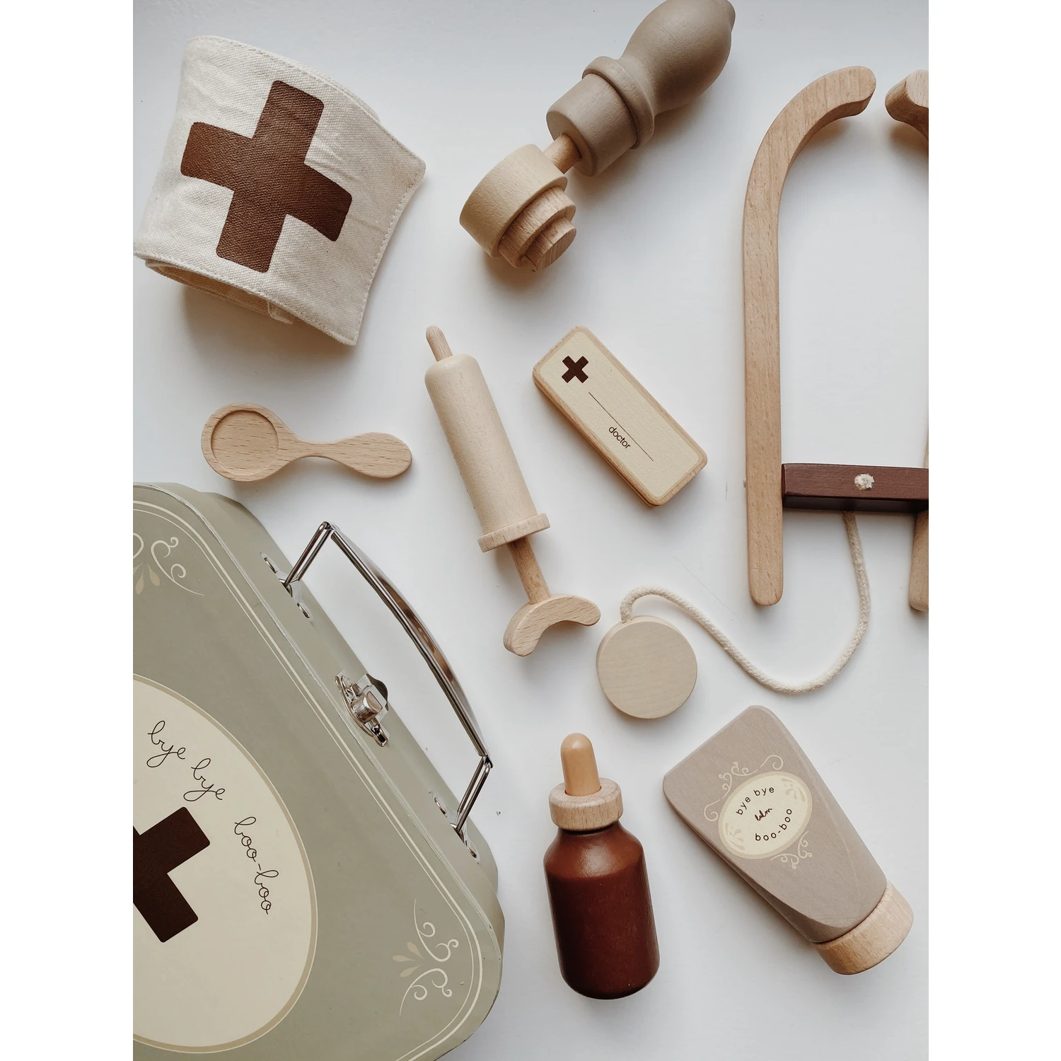 Ce petit set de docteur en bois contient : 1 tube de crème, 1 stéthoscope, 1 seringue, des gouttes, 1 cuillère, 1 otoscope, 1 bandage, 1 badge de médecin. Le tout dans une jolie valise en carton !